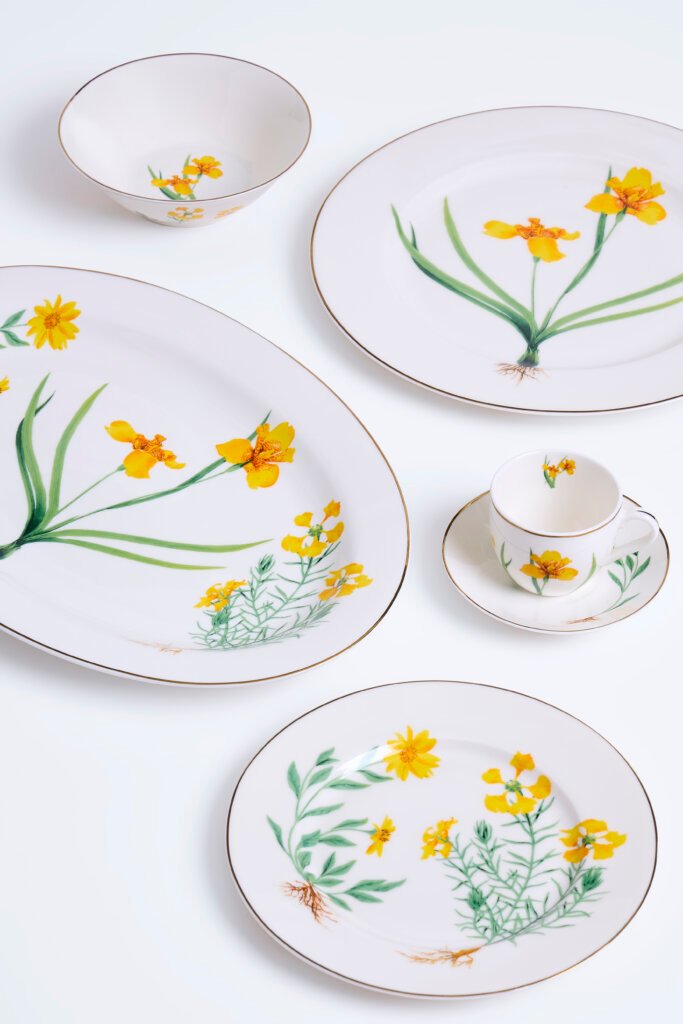 O prato raso recebe a Íris-amarela, símbolo de sofisticação e leveza; já no prato de sobremesa, aparecem a Arnica-do-campo, que floresce rapidamente após queimadas, e a Margarida-do-campo, conhecida por suas propriedades medicinais e usos paisagísticos.