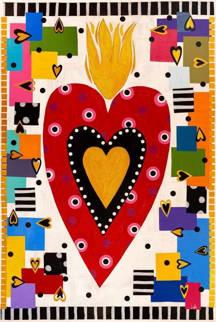 O coração, símbolo central do seu trabalho, representa vida, afeto e continuidade, e está presente em todas as obras como lembranças afetivas e familiares. Algumas são parte de memórias construídas com sua avó paterna a partir de momentos em que, juntas, recolhiam folhas em formato de coração. Assim, ela traduz essas recordações em linguagem visual, transformando-as em uma permanente homenagem. “Minhas composições são marcadas pela vibração das cores e pela repetição de formas, criando ritmo e movimento”, finaliza Lola Albonico.