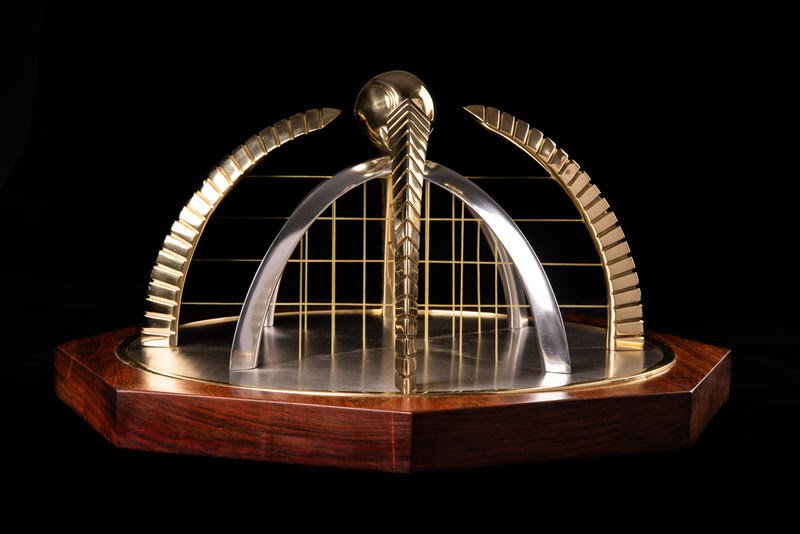 Com 53 cm de largura por 53 cm de comprimento e 25 cm de altura, o troféu pesa cerca de 10 kg. Montado manualmente, peça a peça, ele revela em cada ângulo uma nova camada de intenção. O design reflete a sensibilidade da criação e a energia do jogo, combinando tensão, fluidez e presença em um único gesto tridimensional.